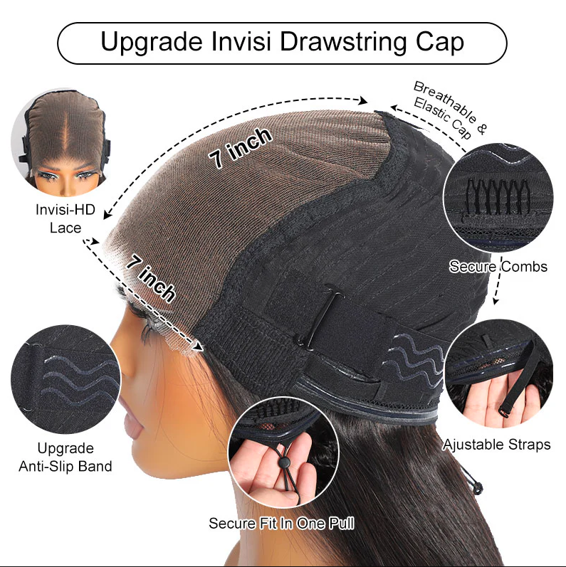 Achieve a smooth, polished look with our premium HD Lace Wig, crafted from 100% human hair for a natural and luxurious finish. This straight HD lace wig features a 7x7 HD lace design, offering a realistic hairline and flexible parting for effortless styling. Designed for comfort and security, this HD lace wig includes an Invisi-Drawstring, breathable and elastic cap, upgrade anti-slip band, and adjustable straps for a snug, glueless fit. The lace is pre-cut, pre-bleached, and pre-plucked, making it beginner-friendly and ready to wear right out of the box.